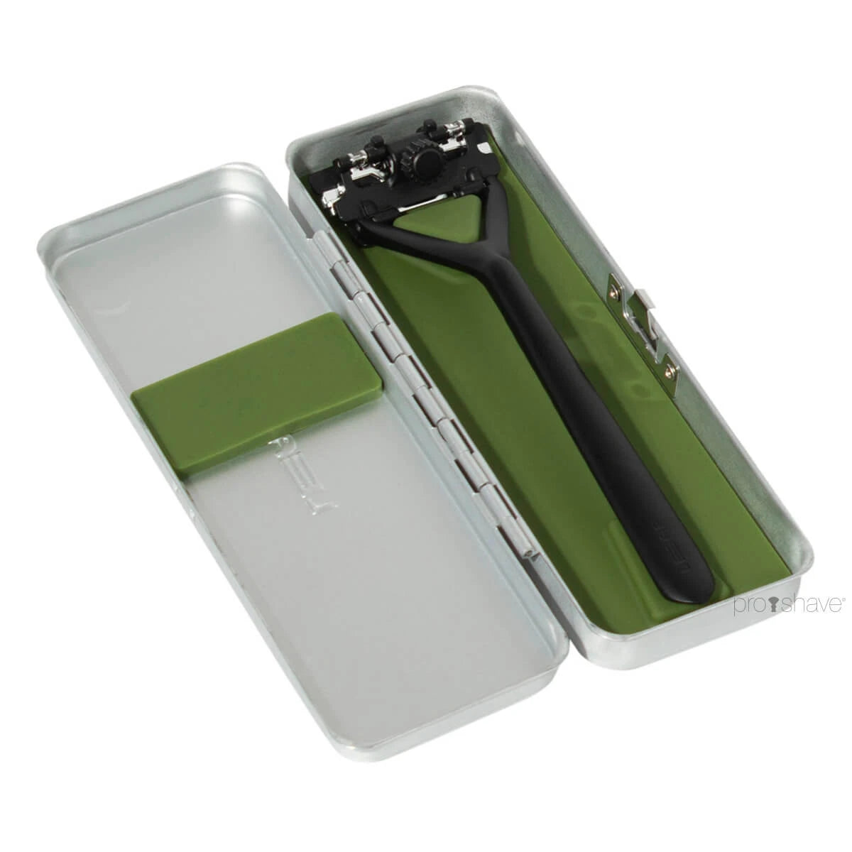 Das kompakte Etui ist aus leichtem, aber stabilem Aluminium gefertigt und lässt sich mit einem praktischen Druckknopf leicht öffnen und schließen. Im Inneren hält ein grüner Silikoneinsatz am Boden den DE-Rasierhobel an seinem Platz und verhindert ein Verrutschen.